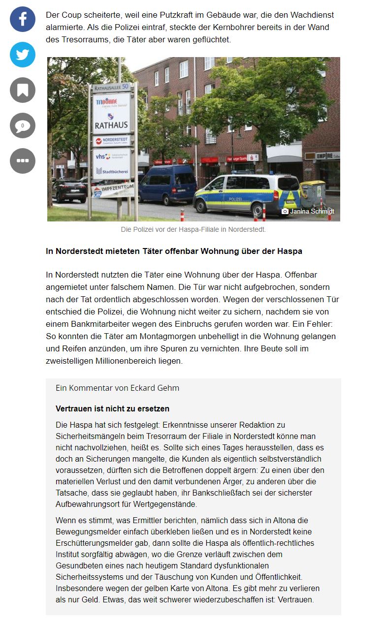 Ein Online-Kommentar auf shz.de zum Schließfach-Raub bei der Haspa in Norderstedt